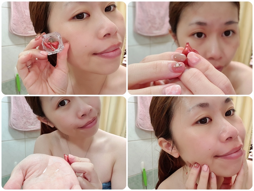 我喜歡將膠囊精華擠於手心,溫熱後在上臉跟脖子做保養